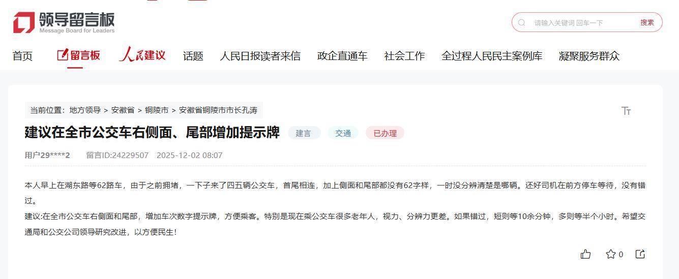 人民网合肥1月6日电 (记者高飞跃)近日,安徽铜陵一网友在人民网“人民建议”留言,建议增加公交车车身侧面及尾部车次标识。