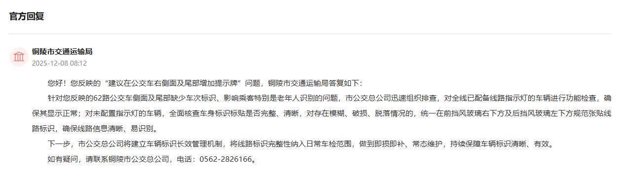 铜陵市交通运输局回应,针对网友反映的公交车侧面及尾部缺少车次标识、影响乘客特别是老年人识别的问题,市公交总公司迅速组织排查,对全线已配备线路指示灯的车辆进行功能检查,确保其显示正常;对未配置指示灯的车辆,全面核查车身标识标贴是否完整、清晰,对存在模糊、破损、脱落情况的,统一在前挡风玻璃右下方及后挡风玻璃左下方规范张贴线路标识,确保线路信息清晰、易识别。